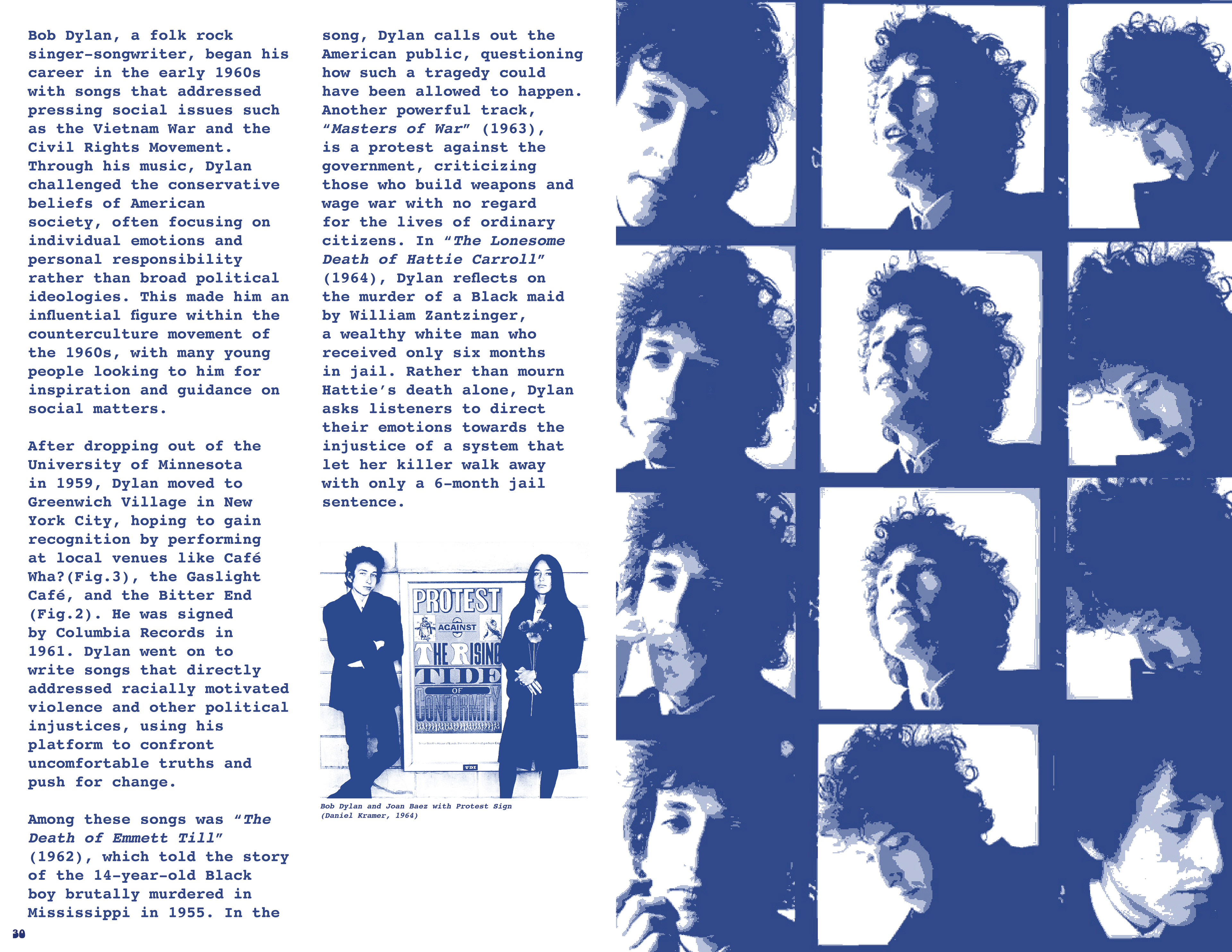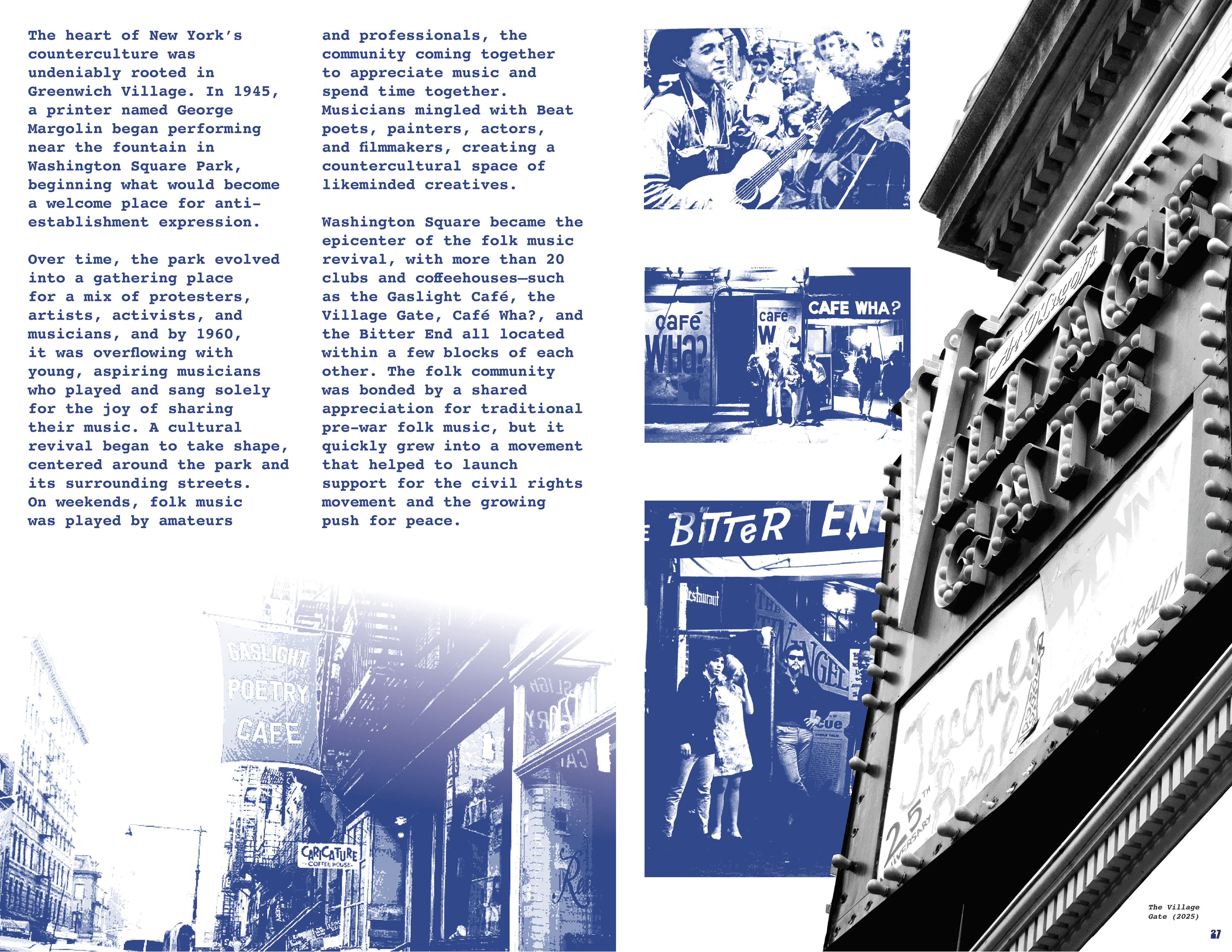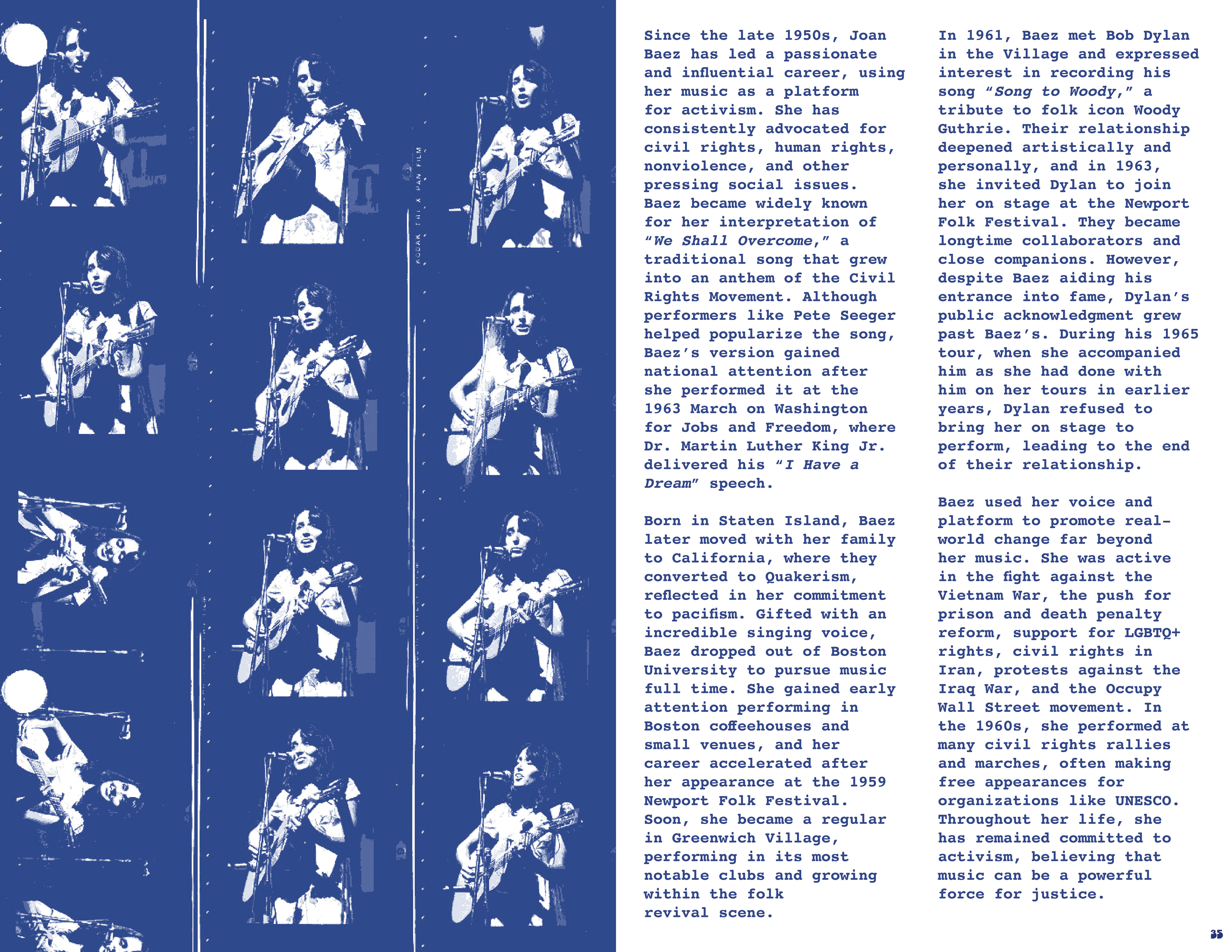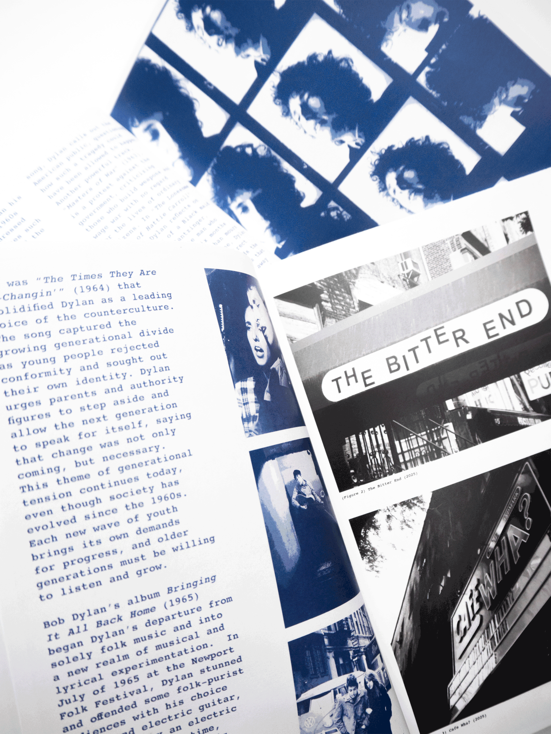 Exploring how music and musicians in 1960s New York helped challenge the political and cultural norms of their time, bringing people together around shared values and amplifying movements for change. In a nod to the self-published books that allowed artists, writers, and activists to bypass mainstream platforms and build community through uncensored expression throughout the 20th century, this project follows a zine format and draws upon the history of underground culture.